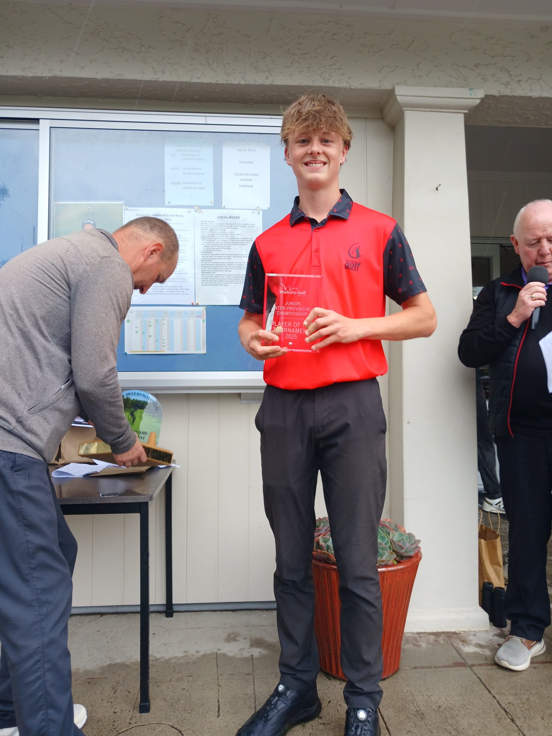 Following that result, the table saw 3 teams in Waikato, Canterbury, and Taranaki all tied on 8 match points, but with Taranaki holding a 0.5 lead on individual wins. With Canterbury taking on Waikato on Friday’s final day and Taranaki playing Harbour, we knew a big result was required to have any chance. Thankfully, the boys came out firing jumping out to an early lead across most matches. Likewise Taranaki also started strong, leading in all but 2 of their matches. As the final 9 played out the Canterbury boys rallied to win 5 of their matches, meanwhile Harbour Golf battled hard and managed to claim a win and half meaning Taranaki were left with 4.5 points from the game, meaning unbelievably both Canterbury and Taranaki finished with 10 match points and 25 individual points, as such the third table divider condition was required which went to game margins. Thankfully, Canterbury comfortably held the advantage in that with their 97 versus Taranaki’s 79, and as such were confirmed as tournament champions, concluding a tense final day! All Canterbury players performed admirably throughout, however the efforts of James Mordaunt on debut at this level for Canterbury stood out as we won all his games, and was awarded the Player of the Tournament accolade.