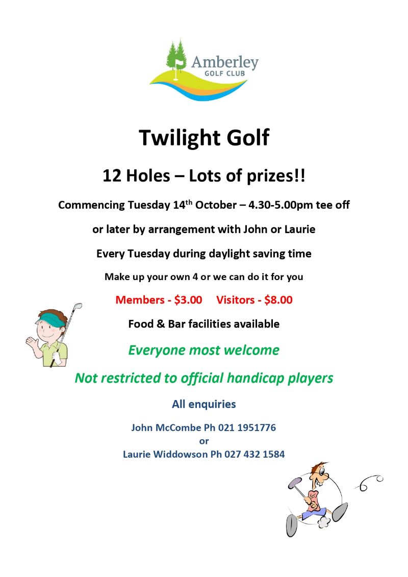Amberley Golf Club | 4:30pm – 5:30pm | Members $3 Visitors $8 | 12 holes | Click here for more information | 021 1951776 |
