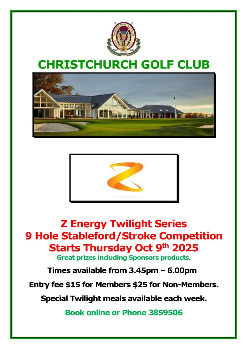 Christchurch Golf Club | 3:45pm – 6:00pm | Visitors $25 | 9 holes | Click here for more information | 03 385 9506 |
