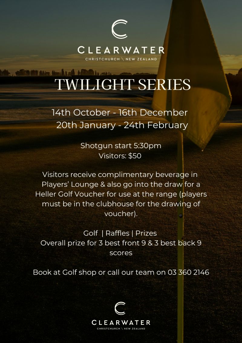 Clearwater Golf Club | 4:00pm – 6:00pm | Members $10 Visitors $50 | 9 Holes | Click here for more information | 03 360 2146 |