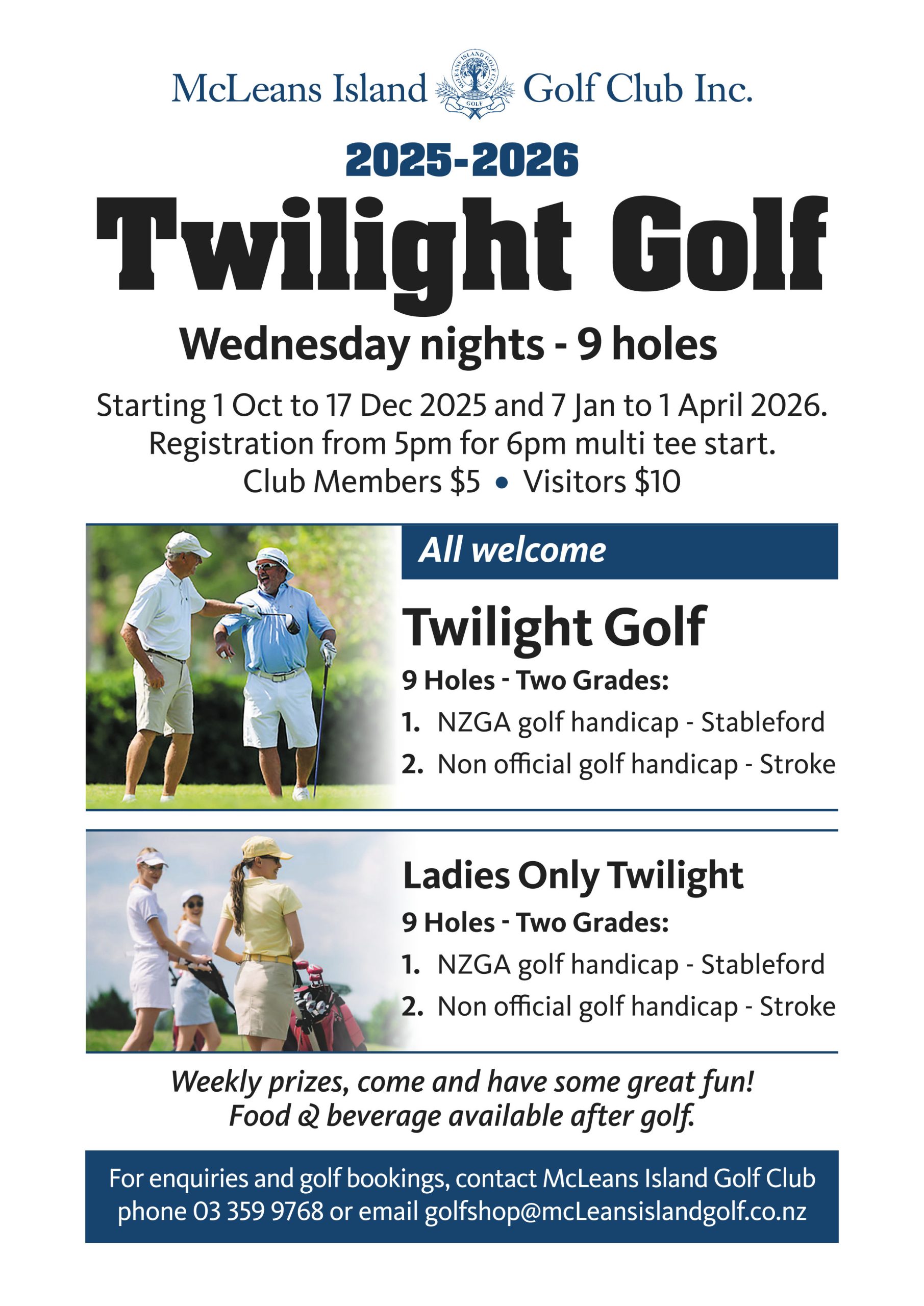 Waitikiri Golf Club | 3:45pm – 5:15pm | All $20 | 12 Holes | Teams Comp, Two’s, NTP, meals post play | 03 383 1400 |