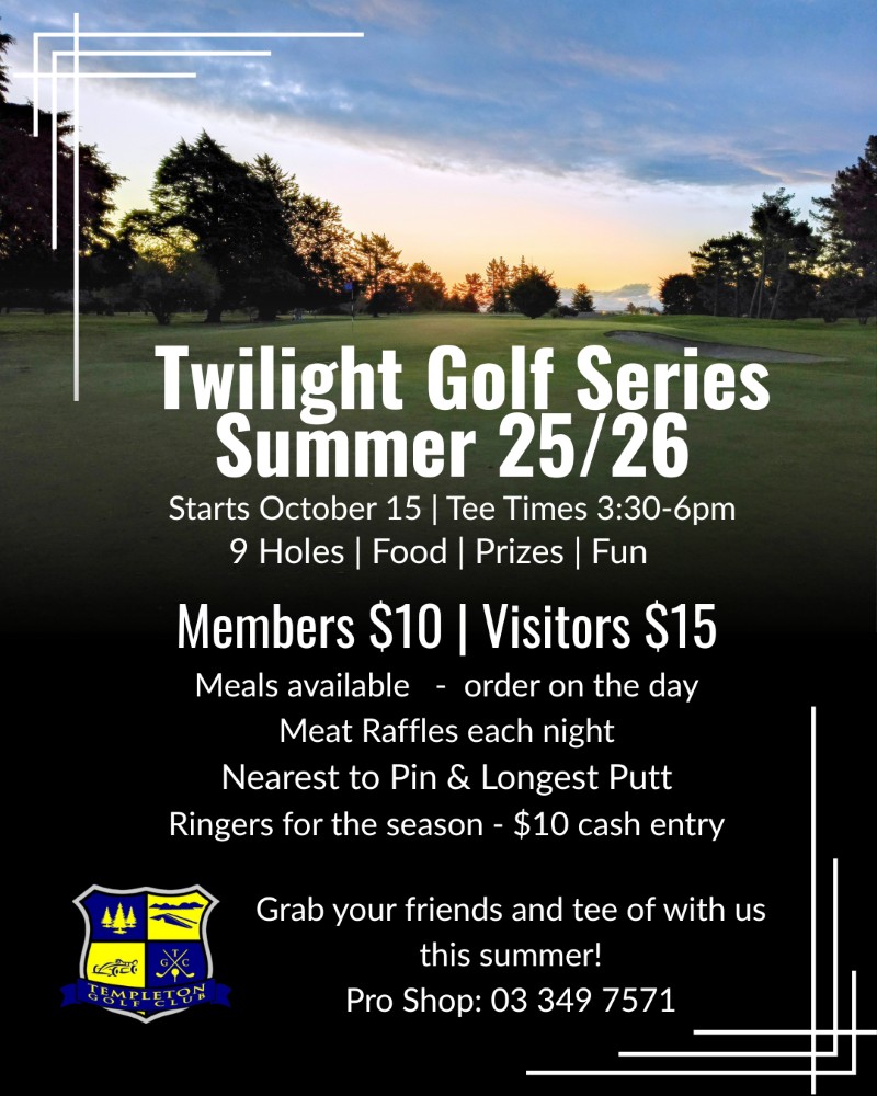 Templeton Golf Club | 3.00pm – 6:00pm | Members $10 Visitors $15 | 9 Holes | Click here for more information | 03 349 7493 |